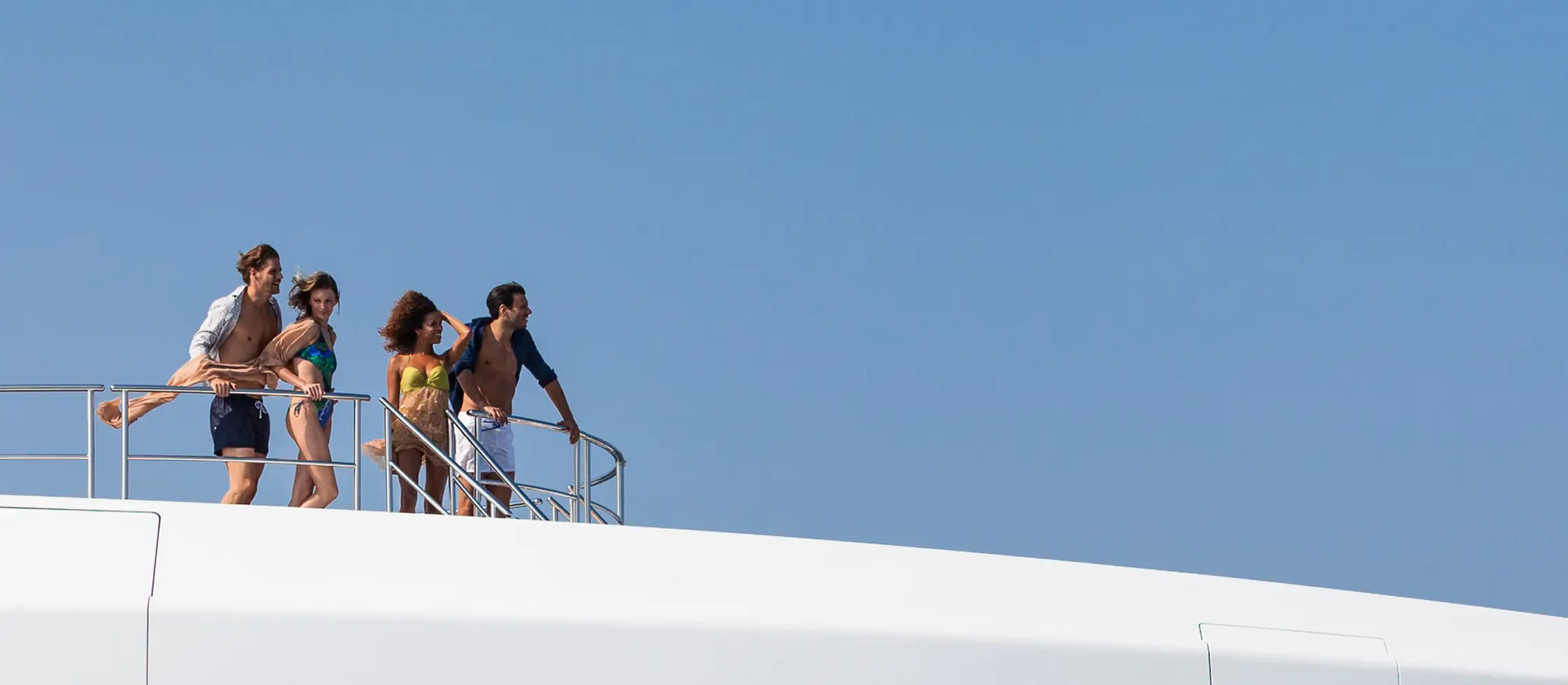 Group of friends standing on the upper deck of a luxury superyacht, enjoying the sun against a clear blue sky.